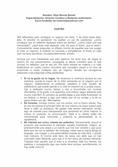 365 REFLEXIONES…- PROYECTO PERSONAL Co-autor del libreo “365 reflexiones para un negocio con éxito” en el que profesionales de diferentes sectores aportaban su visión de cómo llegar a conseguir un negocio exitoso.
